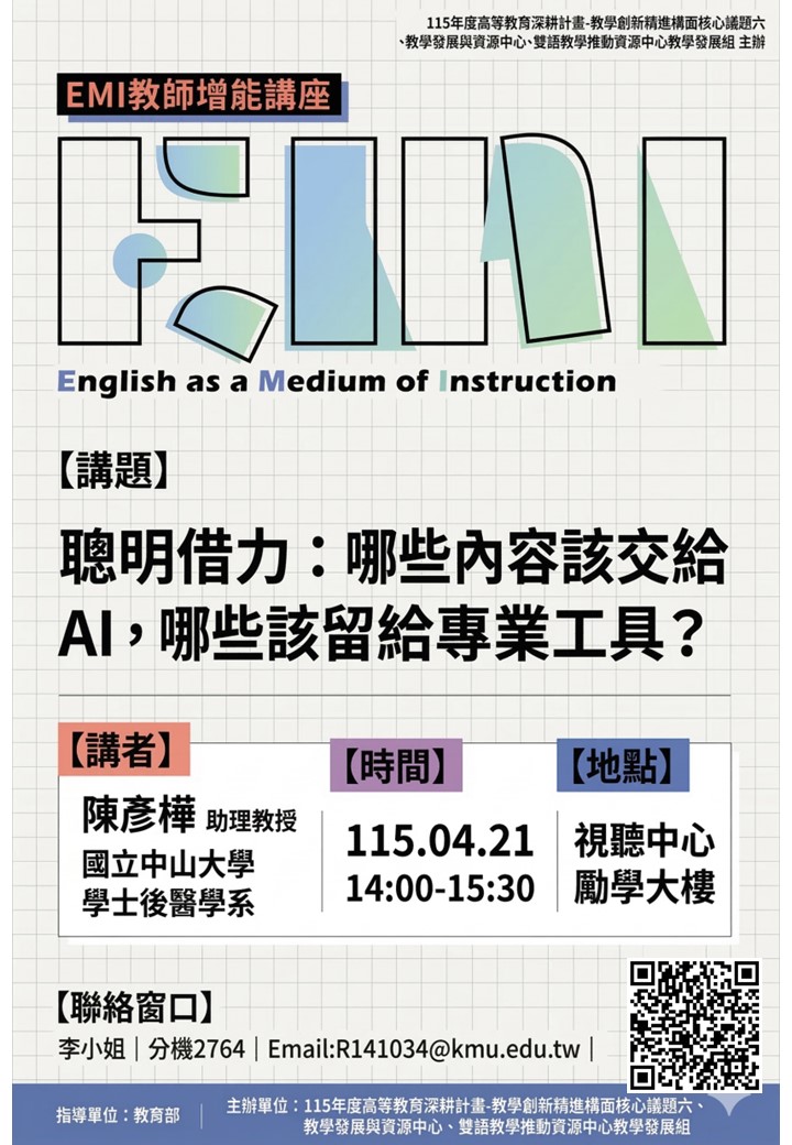 ※主辦單位: 115年度高等教育深耕計畫-教學創新精進構面核心議題六、教學發展與資源中心、雙語教學推動資源中心教學發展組