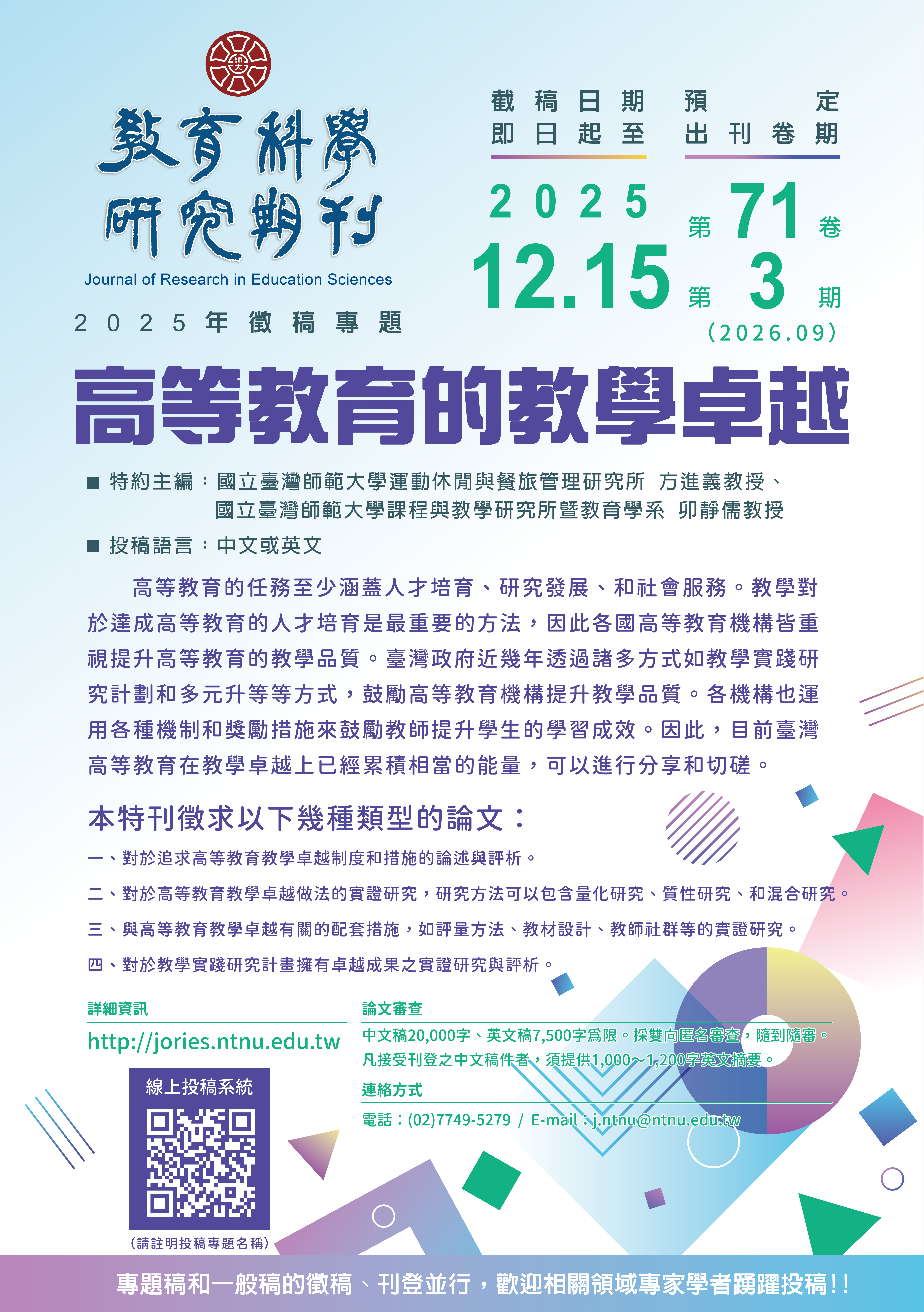 一、115年9月規劃之專題徵稿主題「高等教育的教學卓越」,截稿日期延長至114年12月15日,中英文