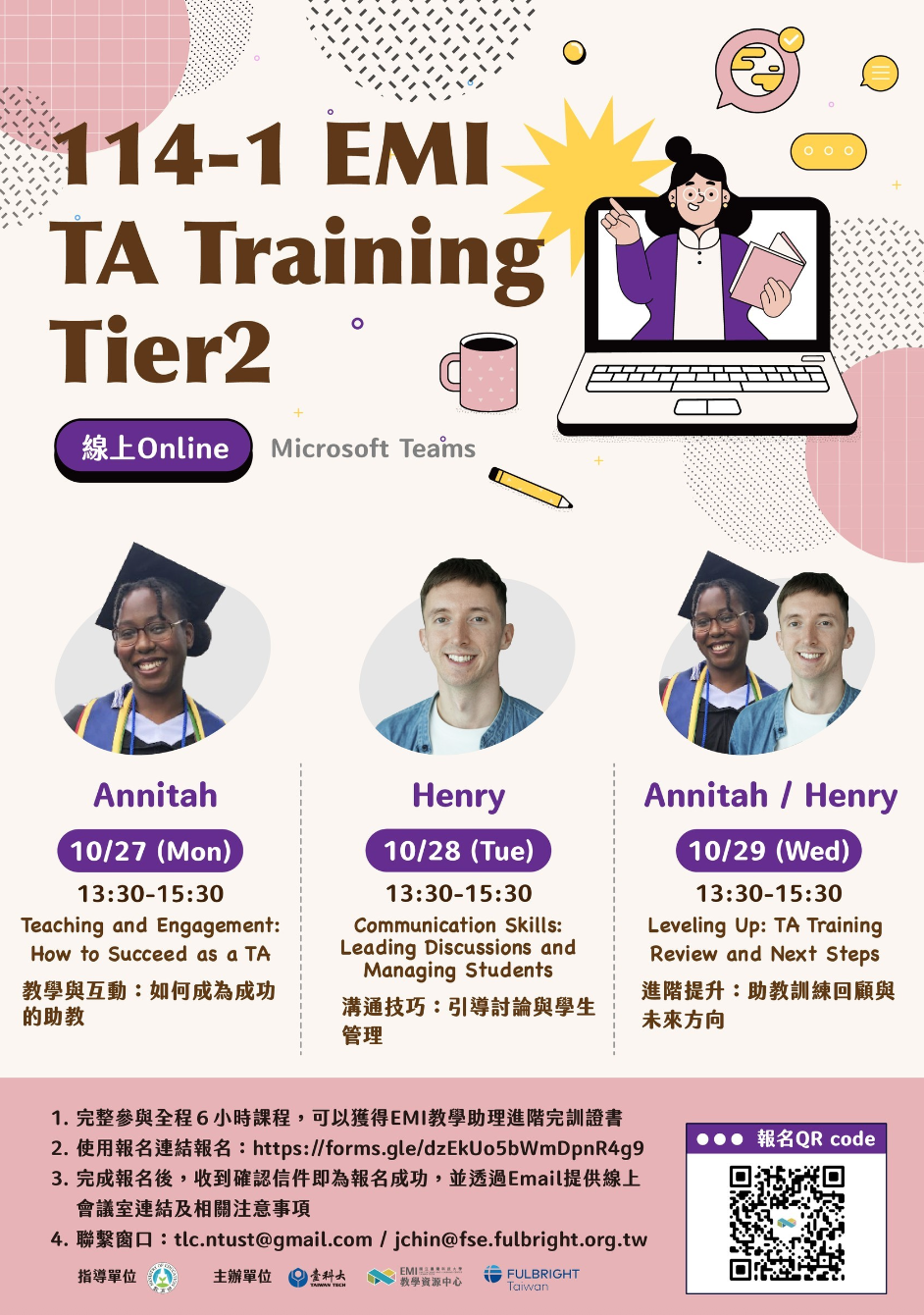 - EMITA培訓進階課程:完整參與全程6小時課程,可獲頒本中心與學術交流基金會核發之「EMITA證書」。課程日期:114年10月27日(一)、10月28日(二)、10月29日(三)。課程時間:13:30-15:30,每次2小時共6堂課。報名網址:https://forms.gle/dzEkUo5bWmDpnR4g9 。
